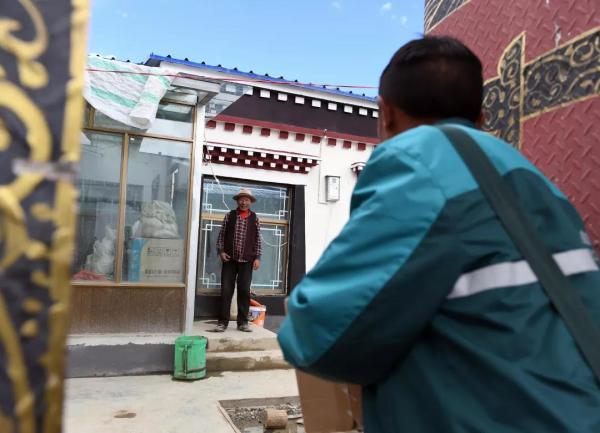 格桑次仁走進(jìn)普瑪江塘鄉(xiāng)沙空村為一戶村民送郵包(7月27日攝)