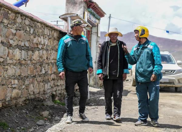 次仁曲巴(左一)和格桑次仁(右一)在普瑪江塘鄉(xiāng)沙空村投遞郵件時和當(dāng)?shù)卮迕窳奶欤?月27日攝)