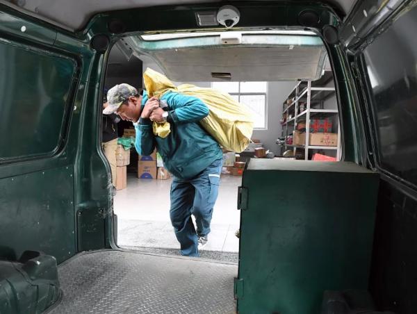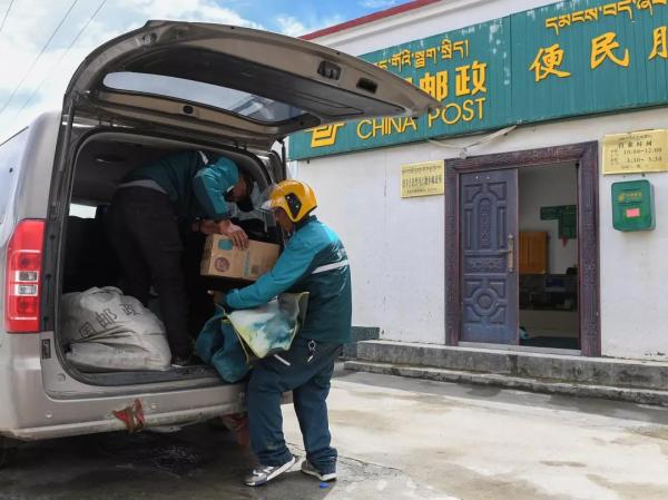 投遞員次仁曲巴向郵車內(nèi)搬運(yùn)需要投遞的包裹(7月23日攝)