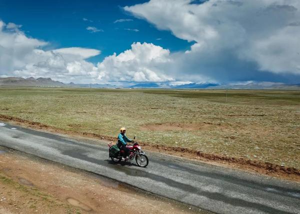 格桑次仁騎摩托車投遞郵件,經(jīng)過長途跋涉后海拔5500米的沙空村出現(xiàn)在前方(7月27日攝)