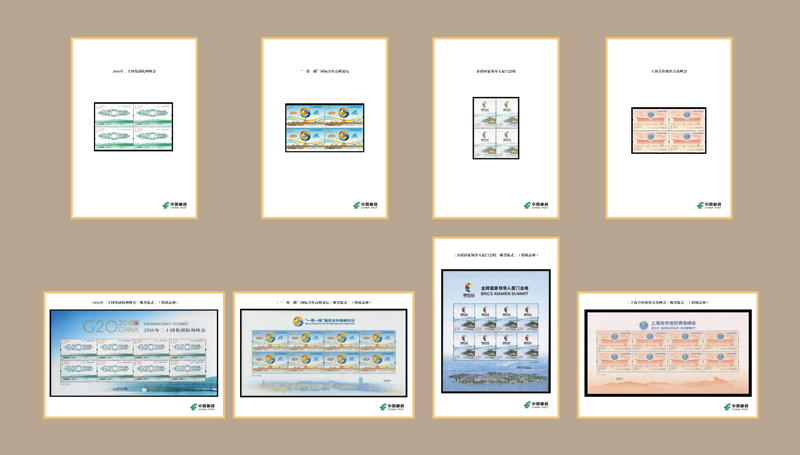 第九展柜展示的主題是“大國(guó)外交”,展現(xiàn)的是近年來(lái)我國(guó)主場(chǎng)重大外交活動(dòng),包括《二十國(guó)集團(tuán)領(lǐng)導(dǎo)人杭州峰會(huì)》《“一帶一路”國(guó)際合作高峰論壇》《金磚國(guó)家領(lǐng)導(dǎo)人廈門會(huì)晤》《上海合作組織青島峰會(huì)》。這四套郵票同時(shí)發(fā)行了絹質(zhì)版式。