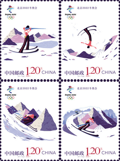 當然,我認為這套郵票的另外一個亮點就是連票。遵從簡約設計理念,四個運動項目共用同一個寬廣的雪景畫面,兩組雪山被4枚郵票共用,每枚郵票分開又可以是獨立完整的畫面,因為這一要求,我在繪制背景時反復調整,花了不少時間。近處的雪山因為要突出主體運動員,我做了曲線時隱時現的虛化處理,和遠山近虛遠實遙相呼應,又可以把四枚郵票串起來,強化了連票的特征。