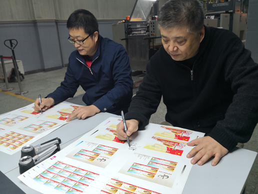 11月29日得知郵票圖稿通過審查即將下廠的消息,制作團隊拿出早已提前準備好的生產方案,但是擺在眼前的就是嚴重不足的生產和發運周期,按常規生產必定不能滿足發行要求。各生產環節的負責人齊刷刷坐在會議室里研究,一個又一個方案都被否決,必須突破常規,從哪里著手?一個提議逐漸獲得越來越多人認可:將版式一、版式二、小型張三個品種同時刻在一個滾筒上,同時調圖刻版、打樣批樣,在后期按生產比例再加刻版式一、小型張滾筒補印,最大限度節省重復刻版和打樣時間。后加工能適應這種方式嗎?印制團隊眼中閃著疑惑和思考,最終變成肯定。行,就這么干!