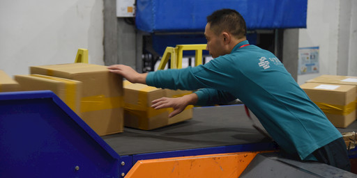 走進包裹處理場地,平時在上午略顯冷清的設備上,到處可見大大小小的包裹隨著機器皮帶流動著。在皮帶分揀機前,鮑光前遇到了一群身著紅馬甲的郵政人。“感謝各位黨員志愿者今天來中心局幫忙網運工作。這會兒皮帶分揀機缺少供件人員,5個人留在這兒,其余的和我一起去幫忙把剛送來的郵件拉到分揀區(qū)來。”說完,鮑光前又帶著大家往場地的另一端跑去。