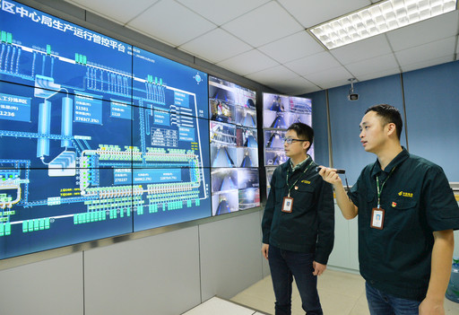 汪磊(右)與團(tuán)隊(duì)成員一起了解生產(chǎn)管控平臺(tái)運(yùn)行情況。