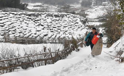 連日來(lái),地處大別山區(qū)的安徽省六安市金寨縣普降暴雪,通村山路被冰雪覆蓋,車輛難以通行。金寨縣張沖鄉(xiāng)郵政所的投遞員谷明洲改用肩挑手提郵件,步行數(shù)十里山路,及時(shí)為群眾投送郵件。圖為金寨縣張沖鄉(xiāng)郵政所投遞員谷明洲踏著被冰雪覆蓋的山路為群眾送郵件。