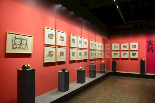 第一部分“生生不息”,意為“生肖輪回,生生不息”,不僅是指人類生命的生長與繁殖,也喻指韓美林藝術創作的變化與創生。這部分的展品,以韓美林創作的十二生肖動物作品為主,依照子、丑、寅、卯等十二生肖的排序,形成既連續又獨立的12個展示板塊。每一個板塊以一個生肖為主題,通過將韓美林相關的平面作品、立體作品以及陶瓷、紫砂、木雕、鐵藝等不同媒介的作品進行展陳布置,既多樣豐富又統一整體。