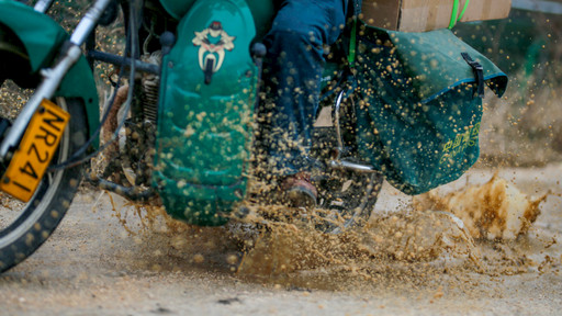 儲選明騎著摩托車在和平鄉西溪村送郵件。