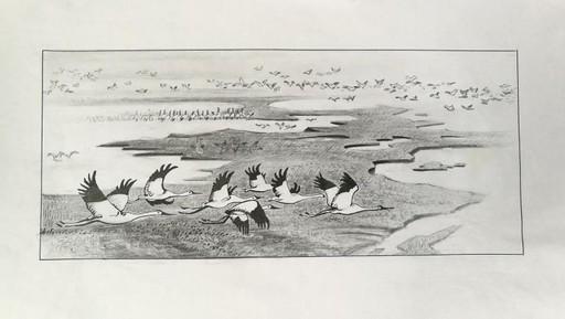 “這枚郵票是整套郵票中創(chuàng)作設(shè)計(jì)難度最大,也是修改次數(shù)最多的。”楊老師介紹,起先并不清楚東方白鸛與白鶴的差別,經(jīng)過專家的詳盡介紹才了解到,白鶴飛時(shí)翅膀是展開的、有些分散,而白鸛飛時(shí)翅膀仍然比較整齊。在后期修改時(shí),白鸛的特寫和造型單獨(dú)畫了好幾次,再借用電腦進(jìn)行合成處理。山與水、湖與江、鳥與草,為了前后照應(yīng),楊老師在該枚郵票上運(yùn)用了一些西洋手法,實(shí)現(xiàn)了中西合璧。
