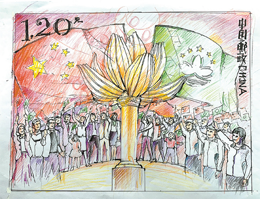 問及同為韓秉華設計的《澳門回歸祖國二十周年》與兩年前的《香港回歸祖國二十周年》郵票有什么變化,他表示:“整體風格差不多,只是構圖不一樣,澳門回歸的相對復雜一些,光是畫面中的人物就多了不少,場面顯得更為熱鬧。”