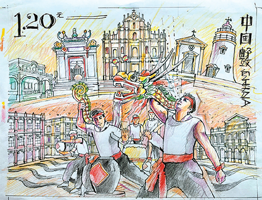 第2枚“中西薈萃 和諧共融”,議事廳前以分別手握龍頭與龍尾的舞醉龍師傅為前景,舞醉龍團隊姿態各異,相互呼應,展現澳門舞醉龍的特色。背景為人們熟悉的澳門標志性景觀大三巴牌坊、媽閣廟、東望洋燈塔,還有葡韻住宅式博物館。“通過中西建筑物的簡化圖形,反映澳門多元文化色彩和諧共融。在舞醉龍的紅、黃、黑、白等傳統色彩與葡式建筑的橘黃、玫紅與白色調糅合下,營造出歡快愉悅的氛圍。”韓秉華介紹。