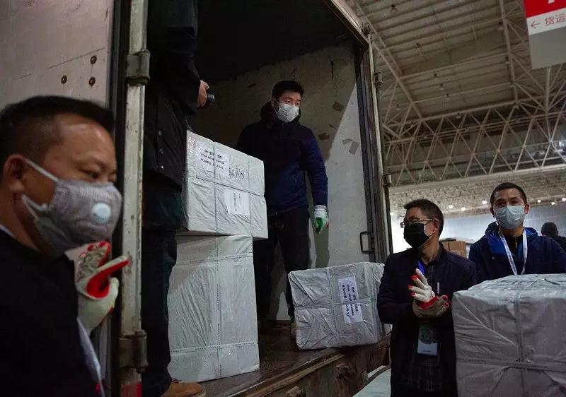 2月1日,武漢國際博覽中心,臨時被征用作倉庫的展廳內,現場志愿者和郵政工作人員從一輛中國郵政郵車上卸下一批來自杭州的醫療物資,其中包括PCR檢測系統等醫療設備。這里匯集了國內外援助物資,來自武漢各個投遞點的郵政工作人員常駐現場,協助對物資進行裝卸、分類和配送。