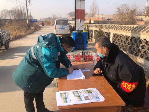 郭樹理在村口配合防疫人員做好登記。