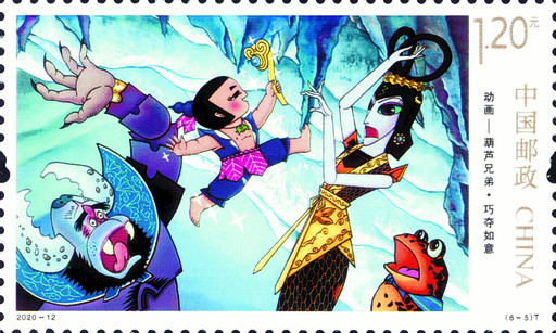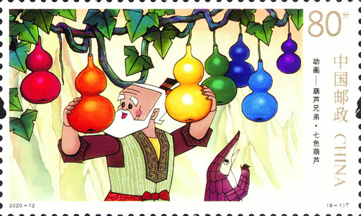 《動畫—葫蘆兄弟》郵票的6枚圖案名稱分別為:七色葫蘆、夢窟迷境、絕路逢生、水火奇功、巧奪如意、七子連心,是中國郵政發行、宋鑒設計的第三套動畫題材郵票。前幾年發行的《小蝌蚪找媽媽》和《動畫—〈大鬧天宮〉》兩套動畫題材郵票均為宋鑒設計。