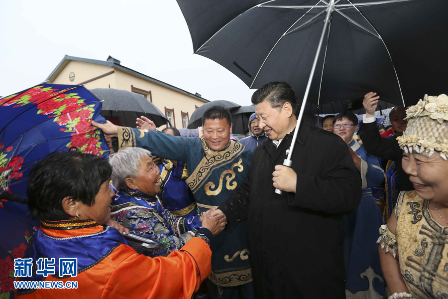 2014年春節前夕,習近平來到內蒙古,看望慰問各族干部群眾。他來到錫林浩特市寶力根蘇木(鄉)冬季那達慕,同牧民們一起觀摔跤,看賽馬,聽長調,賞歌舞。在傳統的“五畜祈福”儀式上,他按照蒙古族習俗,用無名指蘸上銀碗盛著的鮮牛奶彈了三下,祝福來年風調雨順,五畜興旺,人民幸福安康。