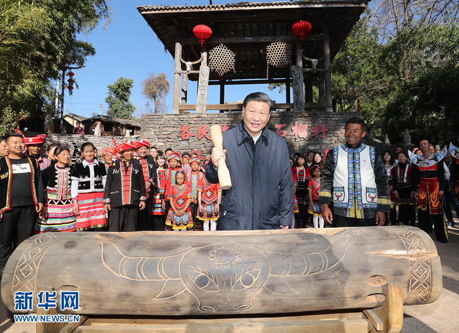 今年1月19日,正在云南考察的習近平來到騰沖市清水鄉三家村中寨司莫拉佤族村。司莫拉,佤語意為“幸福的地方”。習近平說,在大家努力下,你們這里已經實現脫貧并正向新的發展目標努力邁進,可喜可賀。全面建成小康社會之后要全面推進鄉村振興,讓幸福的佤族村更加幸福!按照當地習俗,習近平拿起鼓棒,敲響三聲木鼓,祝福風調雨順、國泰民安、四海升平,并向鄉親們致以新春祝福。