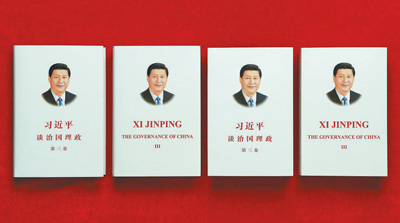 中央宣傳部(國務院新聞辦公室)會同中央黨史和文獻研究院、中國外文局編輯的《習近平談治國理政》第三卷,近日由外文出版社以中英文版出版,面向海內外發行。這是《習近平談治國理政》第三卷中英文版的精裝版和平裝版(六月二十九日攝)。 新華社記者 李 賀攝