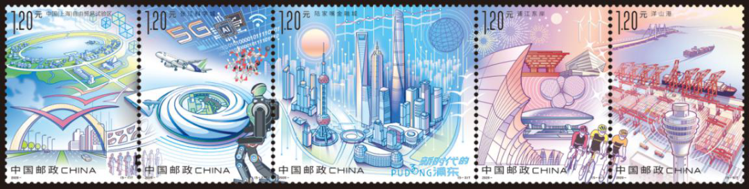 這5枚郵票分別選取了中國(上海)自由貿易試驗區、張江科學城、陸家嘴金融城、浦江東岸和洋山港等五個代表性發展成就作為表現主題,展現了浦東作為上海國際經濟、金融、貿易、航運、科創中心核心承載區建設情況和日益加快的國際文化大都市建設步伐。