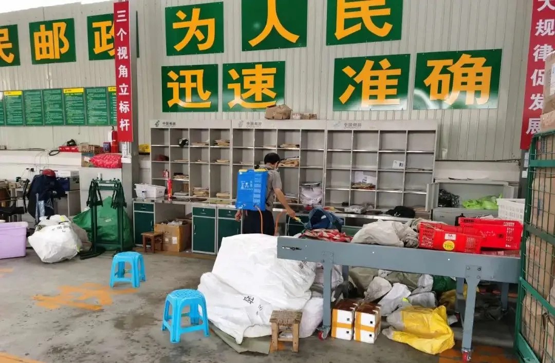 瑞麗市分公司郵件處理中心對郵件及生產(chǎn)區(qū)域進行消毒