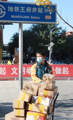 在王府井食品商場鱗次櫛比的商戶中間,譚海波拉著一輛折疊平板車,逐個鋪位“掃貨”——將商戶們封好的包裹整齊地碼放裝車。不到30分鐘,他已經攬收了50多件包裹,這些包裹有的是游客們來京旅游的紀念品,有的是網友們“雙11”瘋狂購物的“戰利品”。在接下來的幾小時中,它們將跟隨王府井營業部的郵車運往全國。