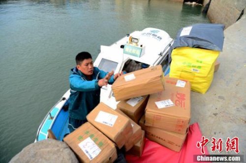 “雙十一”剛過,福建省寧德市蕉城區海上郵遞員石進全比往常更加忙碌。圖為村民到碼頭領取包裹。