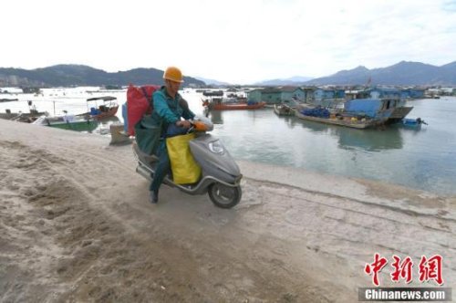 11月12日,石進全開著快艇穿梭在三都澳海上漁村。“雙十一”剛過,福建省寧德市蕉城區海上郵遞員石進全比往常更加忙碌。作為三都澳海域唯一的海上郵遞員,他要服務周邊上千戶漁排人家以及4座海島上8個行政村的信件和包裹。石進全的父親曾搖著櫓為鄉親服務了23年,子承父業的他,也已經在這條海上郵路走了20多年。