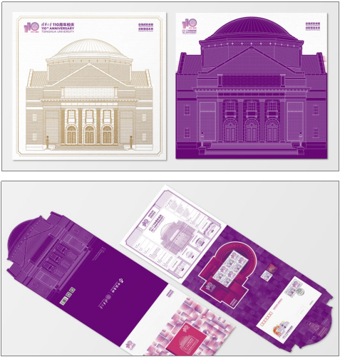 該套郵票特邀清華美術(shù)學(xué)院陳楠教授團隊設(shè)計,主票畫面以“清華紫”結(jié)合豐富的變化層次為畫面主基調(diào),采用插畫形式表現(xiàn)了清華大學(xué)最具辨識度的校園歷史景觀——二校門,突出了校門的厚重感和歷史感,背景淡雅多姿的花朵為象征團隊精神的清華大學(xué)校花——紫荊花,飛舞的花瓣象征了勤奮學(xué)習(xí)的莘莘學(xué)子和默默耕耘的辛勤園丁。附票畫面以清華大學(xué)110年校慶專用標志為畫面主體,結(jié)合標志的網(wǎng)格制圖原理,并搭配燙金設(shè)計效果,形成理性、現(xiàn)代的設(shè)計風格,整體畫面積極向上、自由活潑,凸顯出校慶的熱烈氛圍。