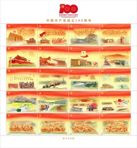按照中國共產(chǎn)黨成立100周年慶祝活動安排,經(jīng)報(bào)請黨中央批準(zhǔn),中國郵政將于2021年7月1日發(fā)行《中國共產(chǎn)黨成立100周年》紀(jì)念郵票1套20枚,紀(jì)念封1套1枚。此次活動發(fā)布了紀(jì)念郵票的詳細(xì)信息,內(nèi)容分別為:1.開天辟地;2.崢嶸歲月;3.中流砥柱;4.偉大勝利;5.開國大典;6.抗美援朝;7.制度奠基;8.自力更生;9.改革春潮;10.對外開放;11.世紀(jì)騰飛;12.科學(xué)發(fā)展;13.擺脫貧困;14.全面小康;15.強(qiáng)軍興軍;16.揚(yáng)帆遠(yuǎn)航;17.信仰;18.偉業(yè);19.攻堅(jiān);20.追夢。郵票采用連票設(shè)計(jì)形式,以紅色、金色為畫面主基調(diào),運(yùn)用油畫寫實(shí)手法表現(xiàn),并采用連綿不斷的飄帶貫穿整體,寓意中國共產(chǎn)黨百年奮斗的光輝歷程。該套郵票特別使用兩色紅熒光油墨,在紫光燈下,慶祝建黨百年標(biāo)識、“一大會址”、“天安門”等郵票主體元素閃放璀璨的光芒。