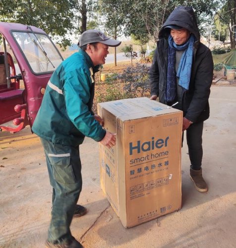 熊桂林為燎原村陳屋基灣村民陳志強老人送去網購的熱水器。