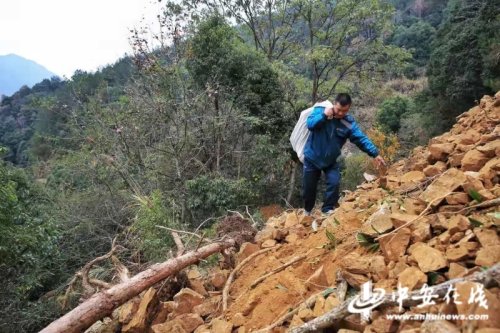 吳義陽(yáng)背著郵包穿越一處塌方地段
