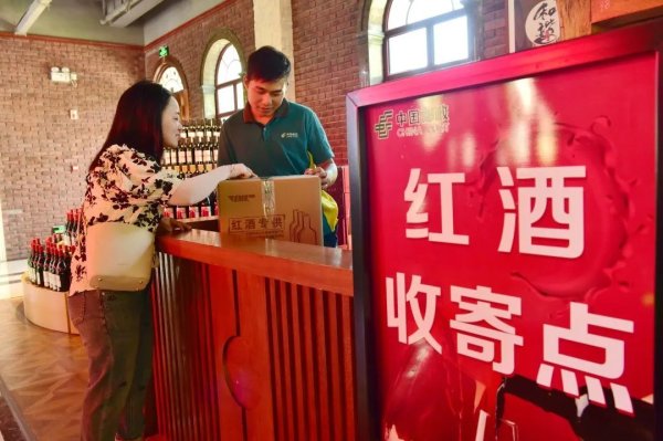 在昊苑村格莉琪酒莊的紅酒收寄點,西夏區郵政分公司火車站攬投部的葉萬文駐點為參觀酒莊的游客提供紅酒打包寄遞服務。