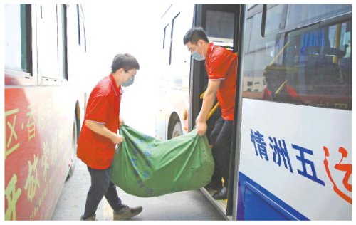 工作人員將分揀完的快遞包裹搬上公交車,送往鎮(zhèn)級快遞網(wǎng)點(diǎn)。(□資料圖)