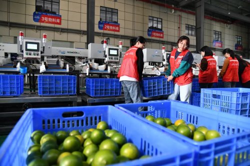 偌大的處理中心里,水果處理插上了智能化“翅膀”。一筐筐水果被送上智能分揀機器,按口徑大小從不同的格口被分揀出來后,再進行打包裝箱。