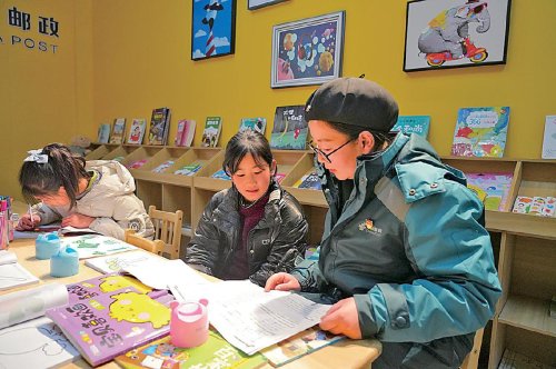 在“愛心書屋”,郵政工作人員陪伴孩子們度過充實、溫馨的寒假時光?! 跞狡啐垺z