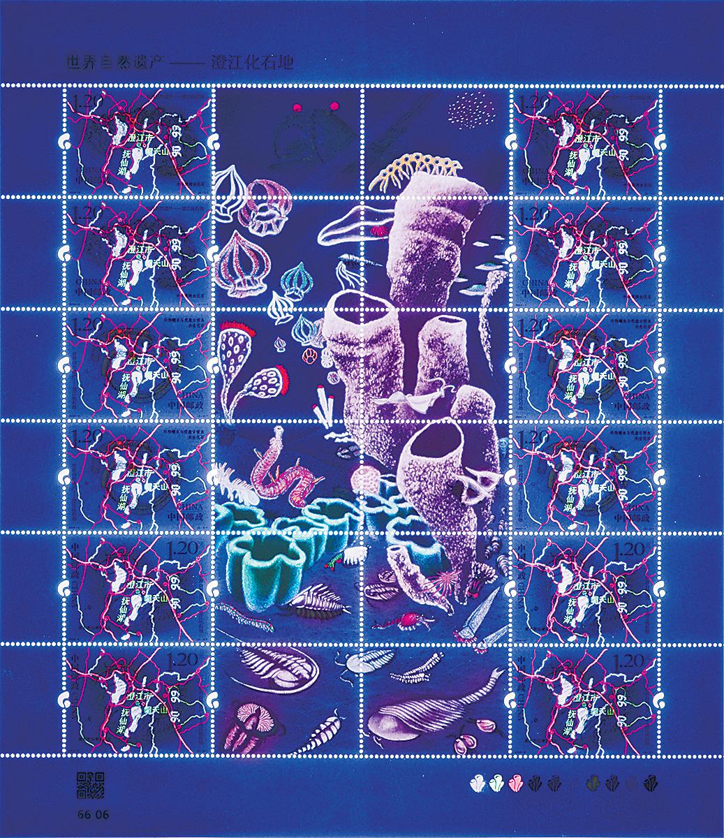 2024年是澄江遺址發現40周年,中國郵政在4月18日“世界遺產日”當天發行《世界自然遺產——澄江化石地》特種郵票一套3枚。在郵票主圖中,設計師用彩鉛的手法繪制中華微網蟲化石、環飾蠕蟲與吸盤古宿蟲共生化石和延長撫仙湖蟲化石,并疊加澄江地圖;郵票附圖中不僅展示了三種化石的復原圖,更展示了多達37個古生物所組成的海底古生物群落的生活場景。