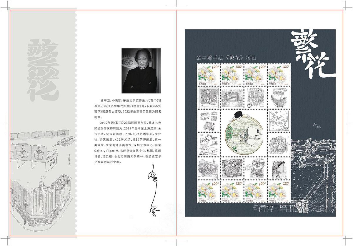 上海市分公司集郵與文化傳媒部集郵業務室項目負責人賈寅承擔著與金宇澄對接設計的工作。在數次的線上和線下聯系中,他感觸良多:“這次整體的溝通過程,讓我感受到了劇中經常提到的‘不響’的處事態度。”據賈寅回憶,金宇澄在雙方明確意向當天,就對所有手繪插圖稿進行整理,精心挑選出反映小說中經典瞬間和場景的13幅插畫,隔天就提供給上海市分公司進行設計制作,這種目標清晰、悶聲做事、執行高效的態度讓他印象深刻。對于圖稿的細節,無論是字體還是顏色,金宇澄都一一斟酌、反復推敲,“‘繁花’二字與郵票邊框處銜接應該是截平,而不是圓筆”“房子和屋頂是個標志,盡量露出來”“郵票上的展現應該比書本更精確”……賈寅感慨道:“從這數次溝通中,我感受到了他們這代人的郵票情懷,他們是真的懂集郵。我也感受到了他們高超的文化素養和審美水平。”