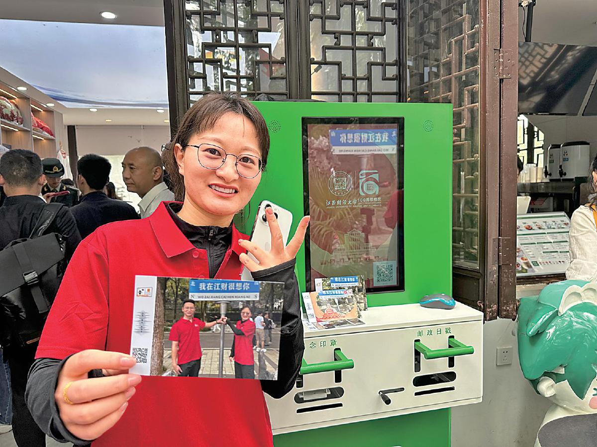 “江財(cái)百年,‘郵’我更精彩。”2023年10月28日,江西財(cái)經(jīng)大學(xué)舉行建校100周年慶典,郵政作為慶典邀請(qǐng)協(xié)助方進(jìn)駐校園提供服務(wù)。除前期定制個(gè)性化郵政明信片及各類文創(chuàng)產(chǎn)品外,現(xiàn)場(chǎng)設(shè)置的明信片打印機(jī)儼然成為校慶活動(dòng)的網(wǎng)紅打卡點(diǎn),手持明信片拍照成了不少校友的必做項(xiàng)目。