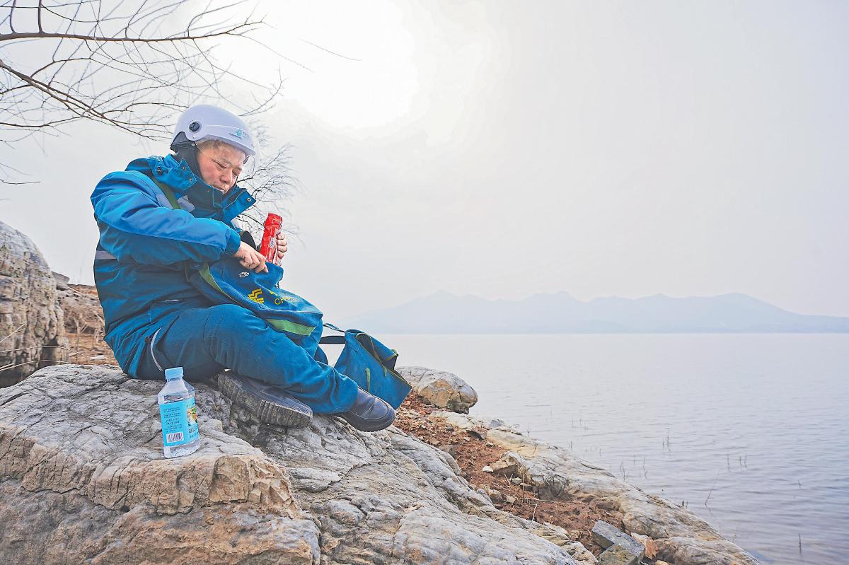 在等待渡船時(shí),石新國吃點(diǎn)干糧、喝點(diǎn)水。 李平 攝