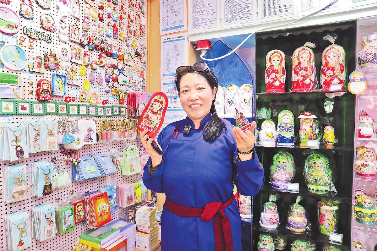 “國門邊居然還有郵局,太神奇了!快幫我拍張照!”在國門景區的入口處,占地200多平方米的滿洲里國門主題郵局吸引了不少游客。跟隨游客的腳步進入主題郵局,分布有序的各個功能區都擠滿了人。“這是我們的爆款——國門冰箱貼,琺瑯工藝,火車還可以自由活動……”記者看到,沒等郵局工作人員介紹完,幾位游客已經快速買下好幾樣文創產品。國門主題郵局負責人項欣介紹說:“我們主題郵局里有郵品、文創產品、特色食品等500多種,以國門為主題的文創產品和鄂溫克族手工藝品都非常受游客喜愛。”