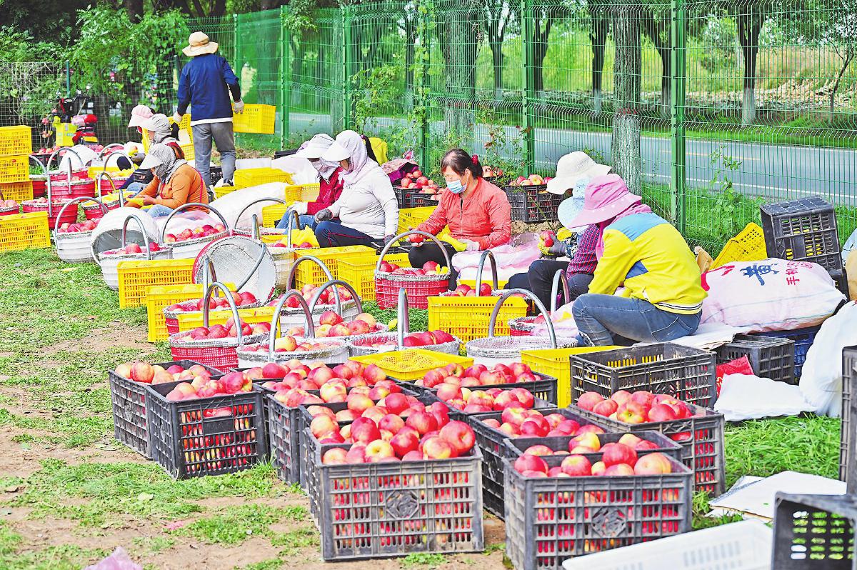 果農在蘋果種植基地選果,準備通過郵政發運。□王秀榮 攝