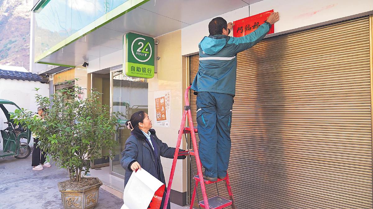 臨近春節,桑南才和妻子在郵政所掛上燈籠、貼上春聯,期望新的一年平安幸福,為鄉親們更好地服務。 □張晉通 攝