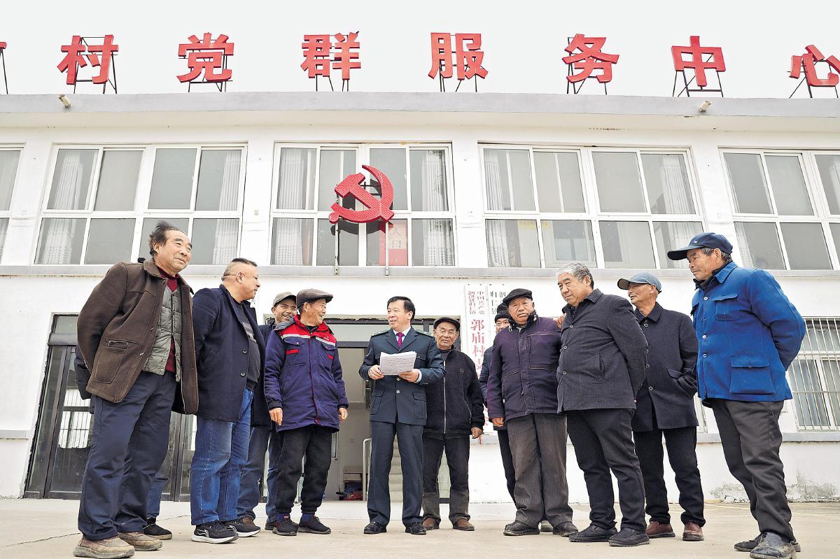 全國人大代表、江蘇省宿遷市泗洪縣郵政分公司歸仁支局局長殷勇向當?shù)厝罕娦v全國兩會精神?! 醢貫I豐 張成 攝