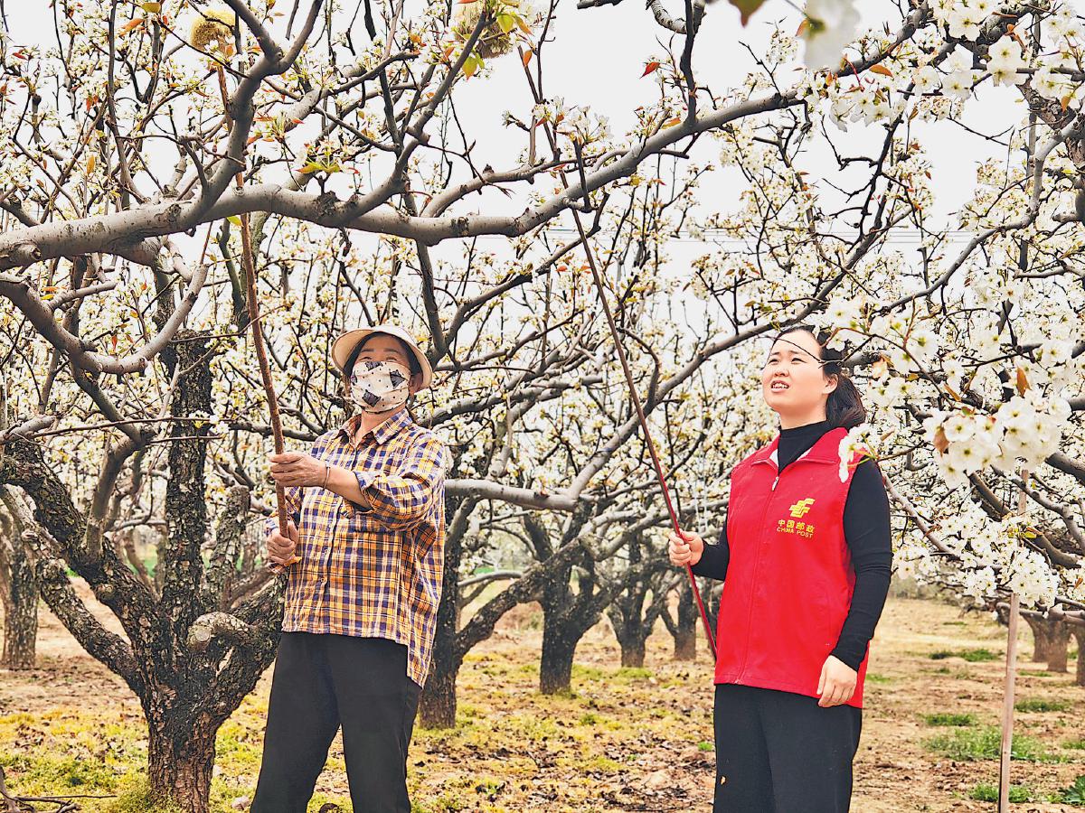 安徽省碭山縣的40萬畝梨花眼下進入盛花授粉期,田間地頭一派繁忙景象。針對部分幫扶對象家庭人手少、勞動力不足等狀況,碭山縣郵政分公司黨支部組織黨員志愿者,深入幫扶村開展助農授粉活動,幫助果農搶抓農時,保證梨樹坐果均勻,豐產豐收。