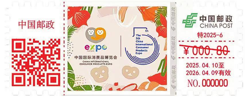 “第五屆中國國際消費(fèi)品博覽會數(shù)字化彩色郵資機(jī)宣傳戳”采用目前最新款TS71郵資機(jī)制作,每一枚戳的規(guī)格為72mm×28.5mm,面值為0.8元,使用期限為2025年4月10日至2026年4月9日,全國共發(fā)行12.1萬枚。票面設(shè)計(jì)分為左中右三塊區(qū)域,左側(cè)印有“中國郵政”字樣;中間區(qū)域?yàn)橹鲌D部分,展現(xiàn)的是消博會的吉祥物“元元”和“宵宵”擁抱的形象,吉祥物的原型是海南獨(dú)有、世界珍貴的靈長類動(dòng)物長臂猿,同時(shí)巧妙地融合了海南熱帶雨林的自然風(fēng)光以及消博會5周年的標(biāo)識,既展現(xiàn)消博會的精品路線定位,又蘊(yùn)含了海南特色風(fēng)貌;右側(cè)的上方印有“中國郵政”字樣及標(biāo)識,下方則是資費(fèi)及使用期限;中間主圖及右側(cè)之間印有郵政特殊金屬防偽線。