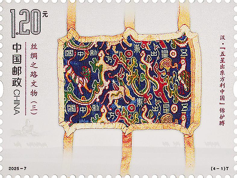 古絲綢之路綿亙萬里,延續千年,積淀了以和平合作、開放包容、互學互鑒、互利共贏為核心的絲路精神,是人類文明的寶貴遺產。該套郵票展現了陸上絲綢之路由西到東沿線的4件珍貴的文物。其中,“五星出東方利中國”錦護膊出土于絲綢之路南道交通要沖的尼雅遺址,為漢代射箭時所用護臂(射褙);神人紋銀盤出土于甘肅省靖遠縣北灘,是中國絲綢之路上發現的重要羅馬文物;凸釘玻璃碗出土于寧夏固原市南郊的北周李賢夫婦合葬墓,該碗形制在薩珊時期的伊朗高原十分流行;胡人牽駝載絲壁畫出土于河南省洛陽市安國相王孺人唐氏墓,生動再現了各國商人來到絲綢之路的東方起點之一洛陽,裝載絲綢走上絲綢之路的場景。