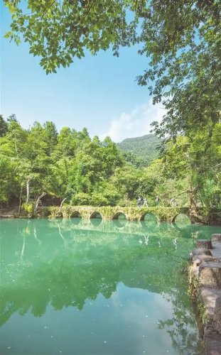 正午的陽光灑向荔波小七孔橋畔,藍綠色的湖水靜若綠寶石,七孔古橋如弦月橫臥碧波之上,橋孔與倒影相映成環(huán)。嶄新的旅游大巴載著來自廣東、江蘇等地的游客駛?cè)脒@片山水,感嘆聲與快門聲立即響成一片。