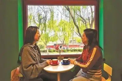 轉(zhuǎn)入二樓,郵政綠與宮門紅相結(jié)合,鮮明的色彩古老又熱烈,加上橙色的高腳椅、白色的小圓桌,光是色彩就足以拿捏住青年人易雀躍的心。點(diǎn)一杯咖啡,再來(lái)份精致的西點(diǎn),坐在窗前,然后就被窗外的景致鎖住心神:萬(wàn)寧橋的碧波垂柳、火德真君廟的飛閣重檐、什剎海畔的游人如織……
