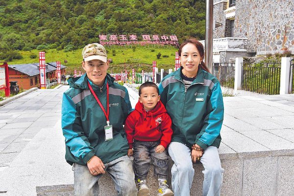玉麥鄉郵政所投遞員旦增桑珠(左)、營業員索朗卓嘎(右)一家人的幸福合照。