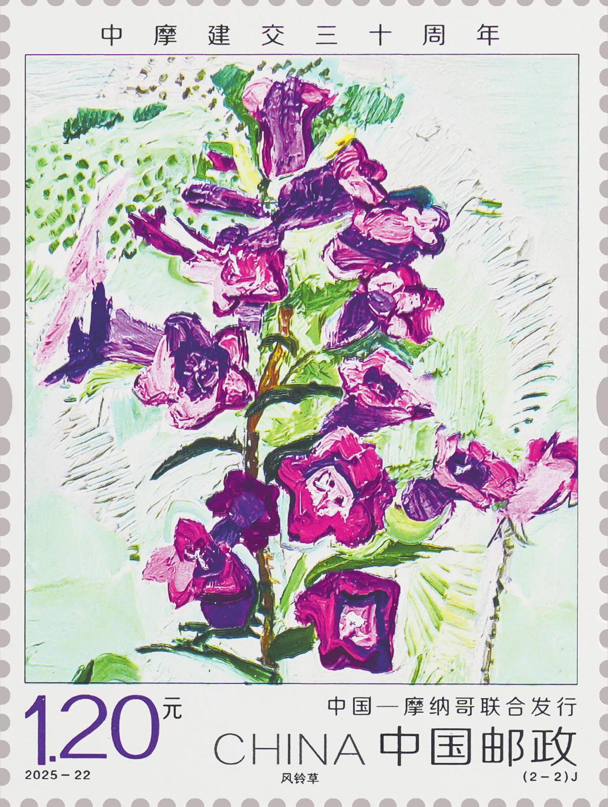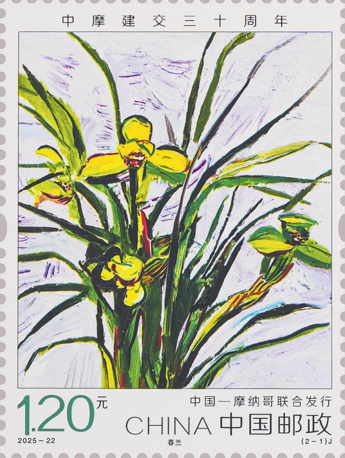 本套郵票分別選用具有兩國民族特色和深厚文化內(nèi)涵的花卉,中國選用栽培歷史悠久的春蘭,摩納哥選用美麗靈動的風鈴草,兩種花卉彰顯出生態(tài)文明的內(nèi)在價值與精神追求。郵票圖案采用油畫表現(xiàn)方式,設(shè)計師通過大膽的構(gòu)圖、恣意的筆觸、靈活的色彩搭配,對具體的物象進行抽象提煉,從而營造出一種生動而富有生命力的畫面效果。兩枚郵票承載著“友誼長存”的深層寓意,希望中摩關(guān)系不斷取得新進展,更好造福兩國人民。