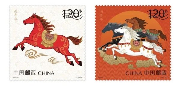 《丙午年》特種郵票由王紅衛(wèi)、趙恩重設(shè)計(jì)。郵票第一枚圖名為“馳躍宏圖”,以“騰躍新時(shí)代”為核心意象,展現(xiàn)了一匹紅馬奔馳于祥云之上,鬃毛如焰,四蹄生風(fēng);第二枚圖名為“萬(wàn)駿臻福”,以“萬(wàn)馬奔騰,馳騁千里”為核心意象,展現(xiàn)了三匹奔跑的駿馬,三為眾,寓意奔騰不息、共同奮進(jìn)。圖案背景及馬身輔以祥云紋、火焰紋、纏枝紋等傳統(tǒng)吉祥紋樣,既隱喻福運(yùn)連綿,亦強(qiáng)化東方美學(xué)底蘊(yùn)。郵票中的駿馬既展現(xiàn)出“一馬當(dāng)先”的開(kāi)拓氣概,也詮釋了“萬(wàn)馬奔騰”的團(tuán)結(jié)力量,將馬的形象與新時(shí)代中國(guó)人民奮發(fā)進(jìn)取的精神風(fēng)貌完美融合于方寸之間。
